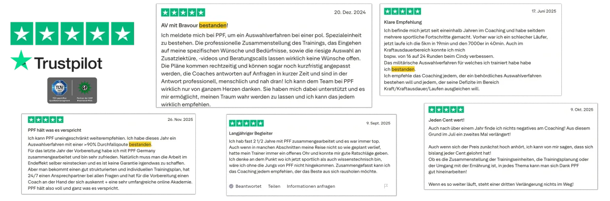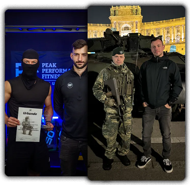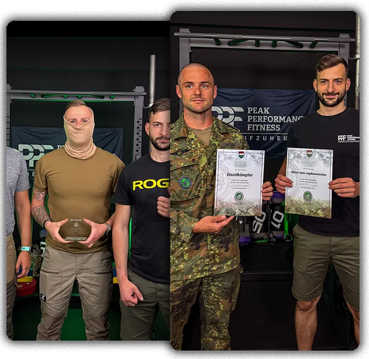 Niklas (Gründer PPF Germany) und Paul (Head Coach) sind keine gewöhnlichen Fitness-Trainer. Als ehemalige Soldaten haben sie in den letzten 7 ein System entwickelt, das bereits über 600 Teilnehmer erfolgreich durch Auswahlverfahren gebracht hat. Mit einer Erfolgsquote von 80% in Tests, bei denen normalerweise 80-90% durchfallen, setzen sie neue Maßstäbe in der EAV Vorbereitung und waren die Ersten in Deutschland, die so etwas gemacht haben. Ihr Team aus aktiven Spezialkräften bringt jahrelanges Insider-Wissen und praktische Erfahrung mit, welches du nirgendwo anders bekommst.